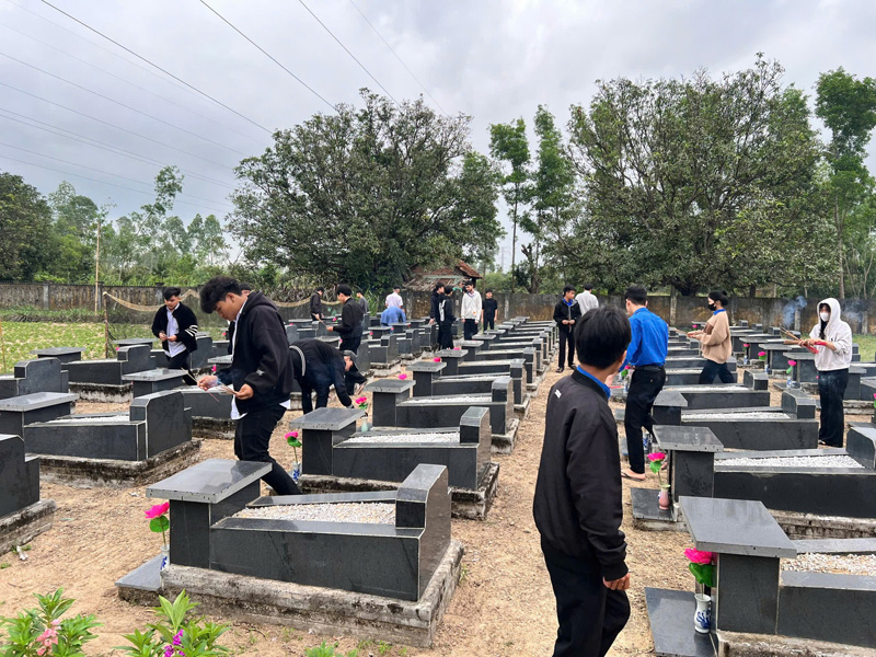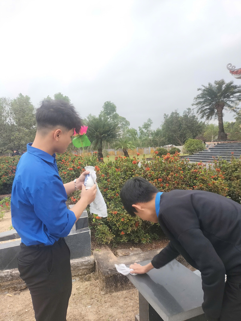 Tham gia tại buổi lao động có Chi đoàn giáo viên cùng hơn 50 đoàn viên đại diện cho các các Chi đoàn 10, 11A1, 11A2, 11A3, 12A1, 12a2. Các Đoàn viên thanh niên đã dâng hương tưởng niệm các anh hùng liệt sĩ; tiến hành làm cỏ, nhặt rác, quét lá cây, lau bia mộ, cắm lại hoa trên những phần mộ tại nghĩa trang.