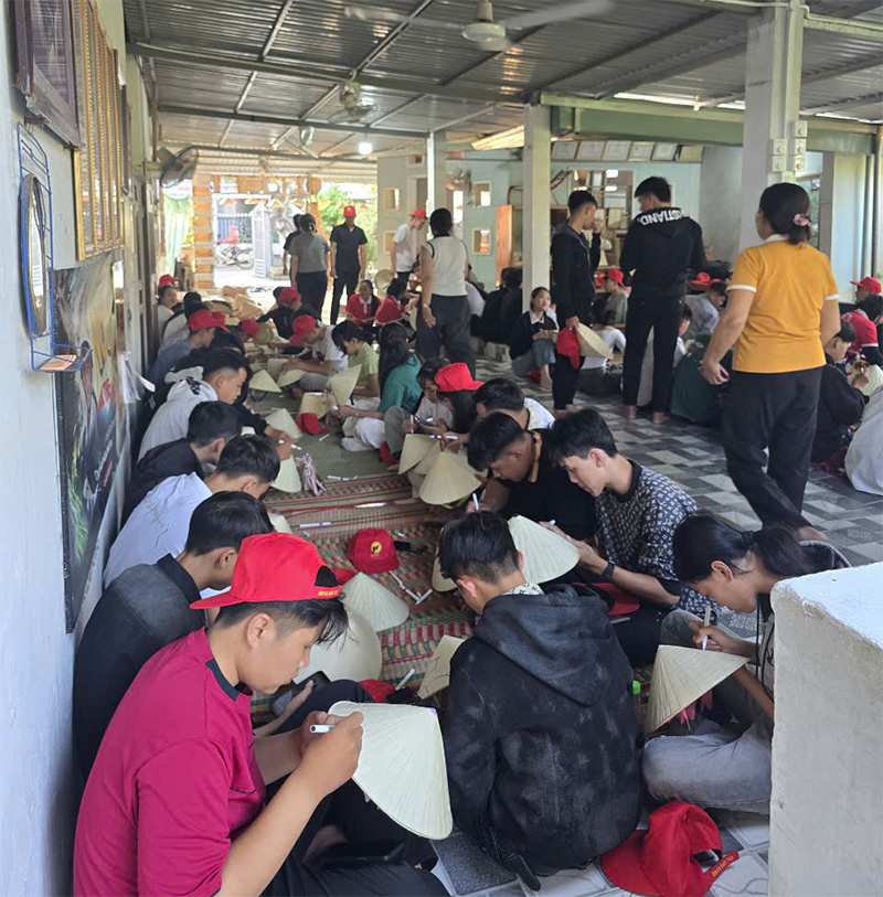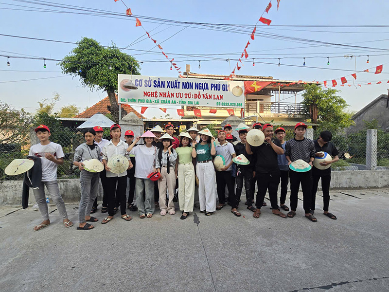 Tiếp tục hành trình hoạt động trải nghiệm, Đoàn đến tham quan và trải nghiệm nghề chằm nón lá Làng nón ngựa Phú Gia (xã Xuân An). Đến đây, học viên được tìm hiểu kỹ quá trình hình thành và phát triển nghề chằm nón lá truyền thống trên quê hương anh hùng áo vải cờ đào Nguyễn Huệ – vua Quang Trung. Các em được các nghệ nhân hướng dẫn một số công đoạn làm ra chiếc nón lá xuất khẩu giá trị kinh tế cao, đồng thời các em cũng được tặng và thỏa sức trang trí lên những chiếc nón lá truyền thống, tăng tính tư duy và sáng tạo cho các em.