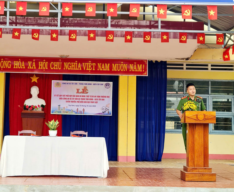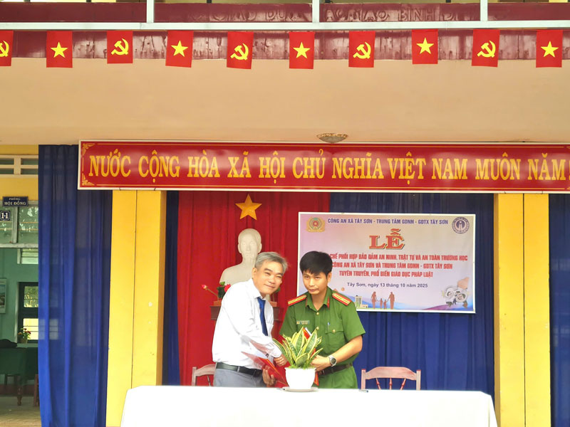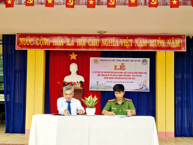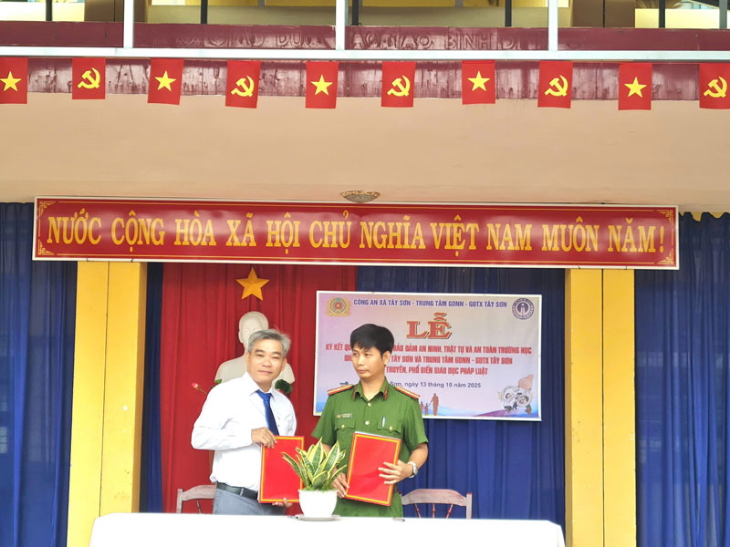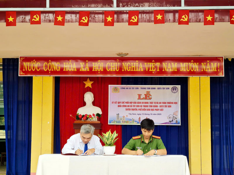 Ngày 13/10/2025, Trung tâm GDNN-GDTX Tây Sơn phối hợp cùng Công an xã Tây Sơn tổ chức Lễ ký kết Quy chế phối hợp trong công tác đảm bảo an toàn trường học, an ninh trật tự và phòng, chống tội phạm, tệ nạn xã hội trong Trung tâm. Đây là một hoạt động có ý nghĩa thiết thực, thể hiện sự quan tâm sâu sắc của các cấp, các ngành, đặc biệt là lực lượng Công an, đối với công tác giáo dục thế hệ trẻ – những chủ nhân tương lai của đất nước.